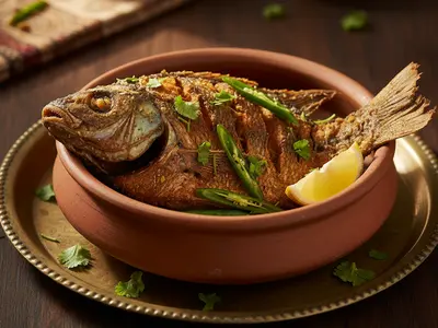 Shah Abdul Latif Bhittai, Sindh's most celebrated poet, wrote verses about the pallo migrating upriver — using it as a metaphor for spiritual longing and the soul's journey toward its origin. Pallo — known as hilsa or shad elsewhere — is the most prized freshwater fish in Pakistan, caught from the Indus River, and its season (typically June-August, though climate change is affecting this) triggers an almost celebratory mood in Sindhi households. The fish is rich, oily, and flavourful beyond description — some call it the 'king of river fish'. Fun fact: pallo contains one of the highest concentrations of omega-3 fatty acids of any freshwater fish in South Asia. It's also notoriously bony, which is why experienced Sindhi cooks fry it until the smaller bones become edible. The marinade is simple but effective: ajwain (carom seeds), red chilli, turmeric, and lime juice. The frying is hot and quick. The result is extraordinary. If you can find pallo/hilsa, make this immediately. If you can't, pomfret or rohu work as substitutes.