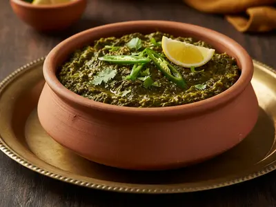Sarson Ka Saag is Punjab's winter soul food — slow-cooked mustard greens with spinach and spices, finished with ghee-fried garlic and served with makki ki roti (cornbread). A dish so tied to Punjabi identity that it's practically a passport.