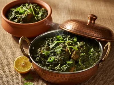 Sarson Ka Saag is Punjab's winter soul food — slow-cooked mustard greens with spinach and spices, finished with ghee-fried garlic and served with makki ki roti (cornbread). A dish so tied to Punjabi identity that it's practically a passport.