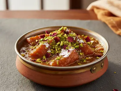 The royal bread pudding of the Mughal kitchen — thick slices of day-old white bread fried until shatteringly golden, soaked in fragrant sugar syrup, then generously drowned in saffron-and-cardamom-scented rabri (thickened sweetened milk) and finished with silver leaf and pistachios. Every bite is rich, sweet, and unapologetically indulgent.